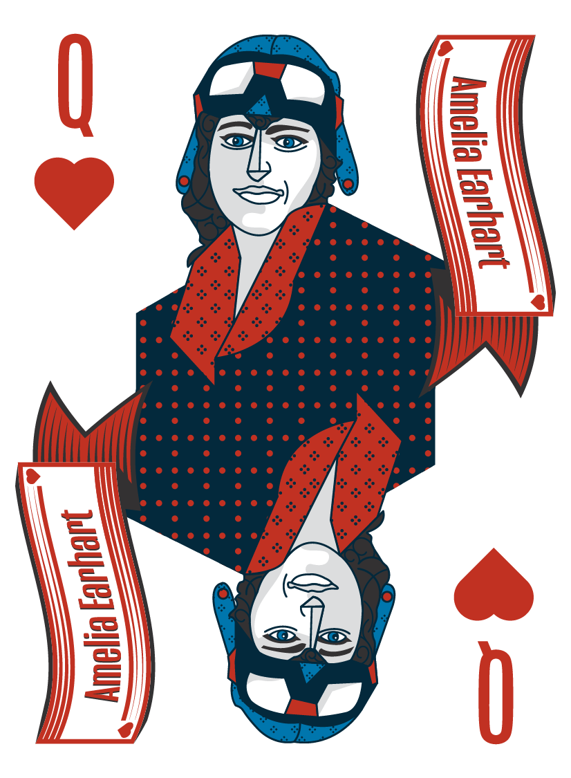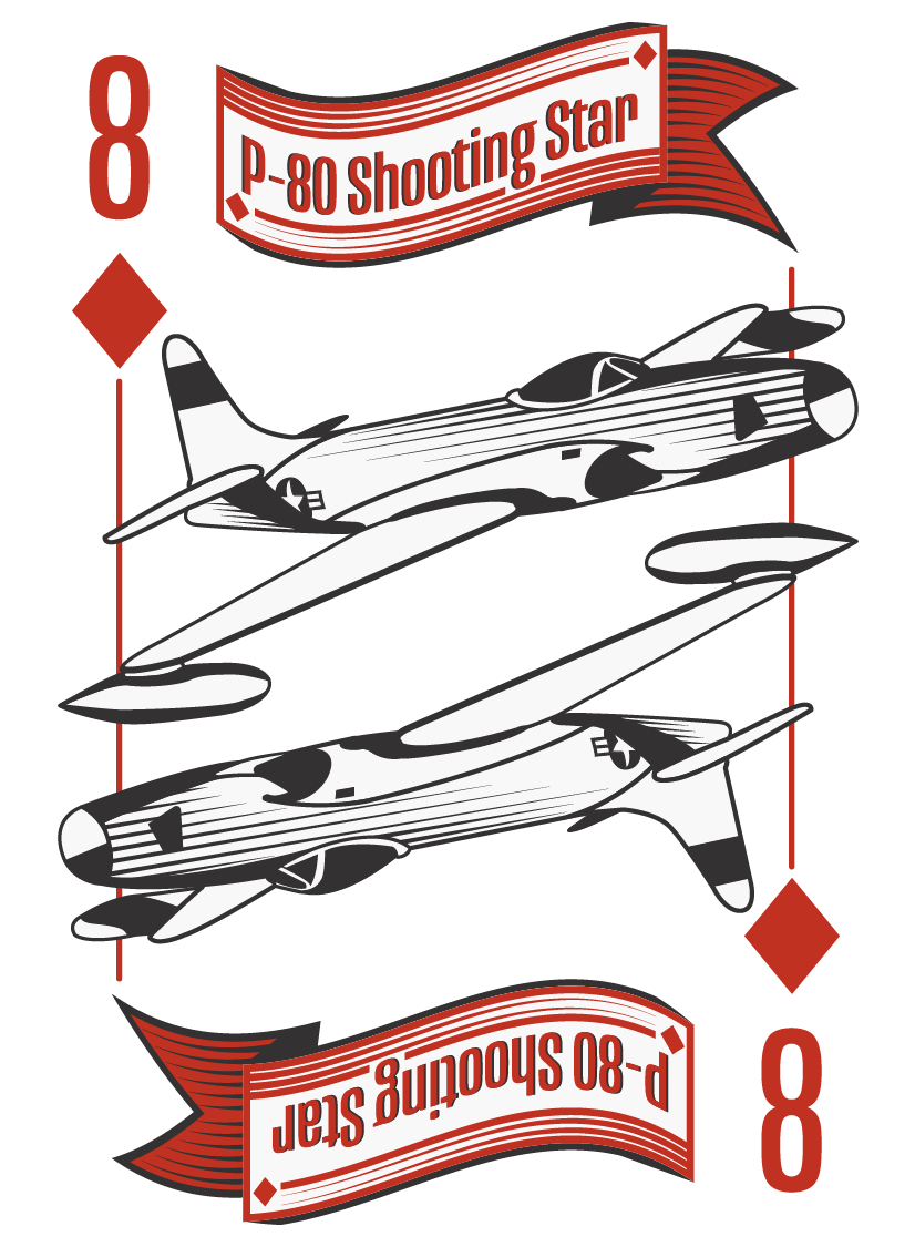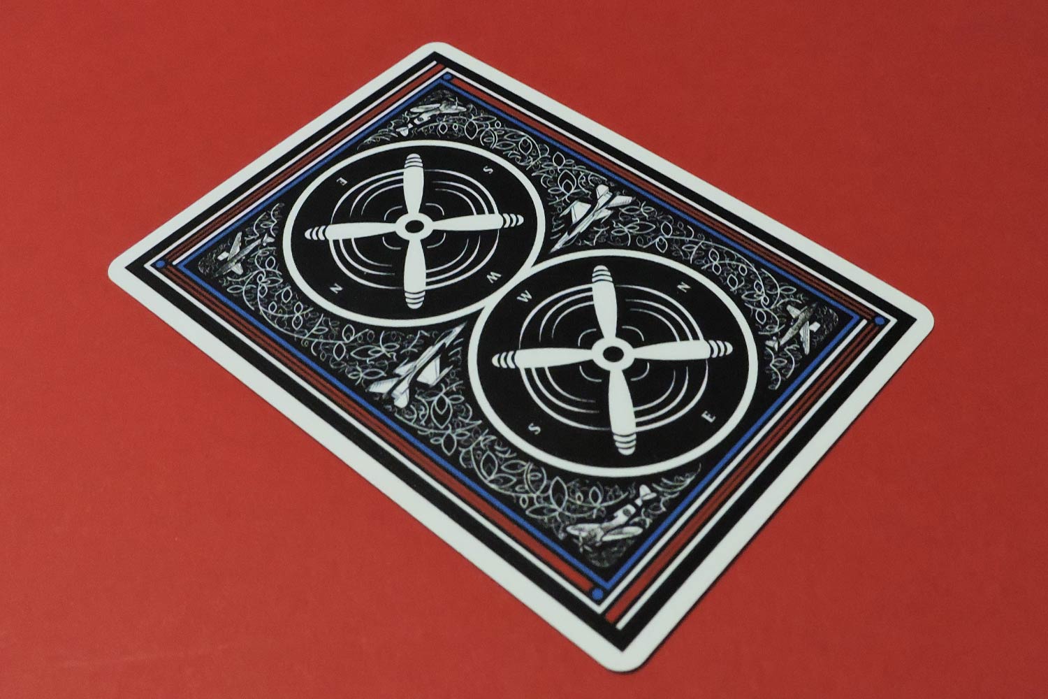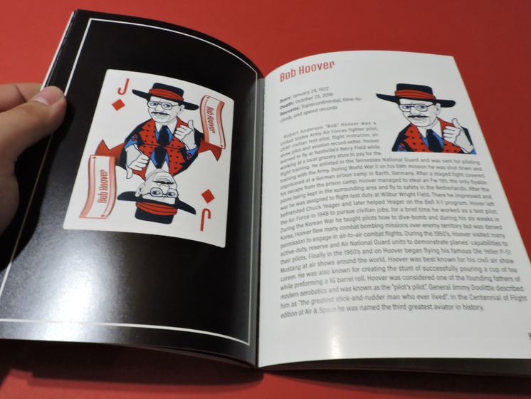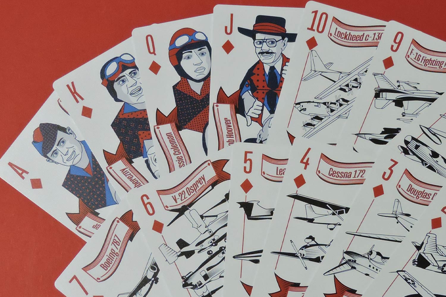 The number cards in this deck feature famous types of planes like the Bell-x1, the first plane to go faster than the speed of sound. Also features the Rutan Voyager, first aircraft to fly around the world without refueling. The face cards feature prominent aviators like Amelia Earhart and the Wright Brothers. The Aces feature exceptional pilots like Bob Hoover.