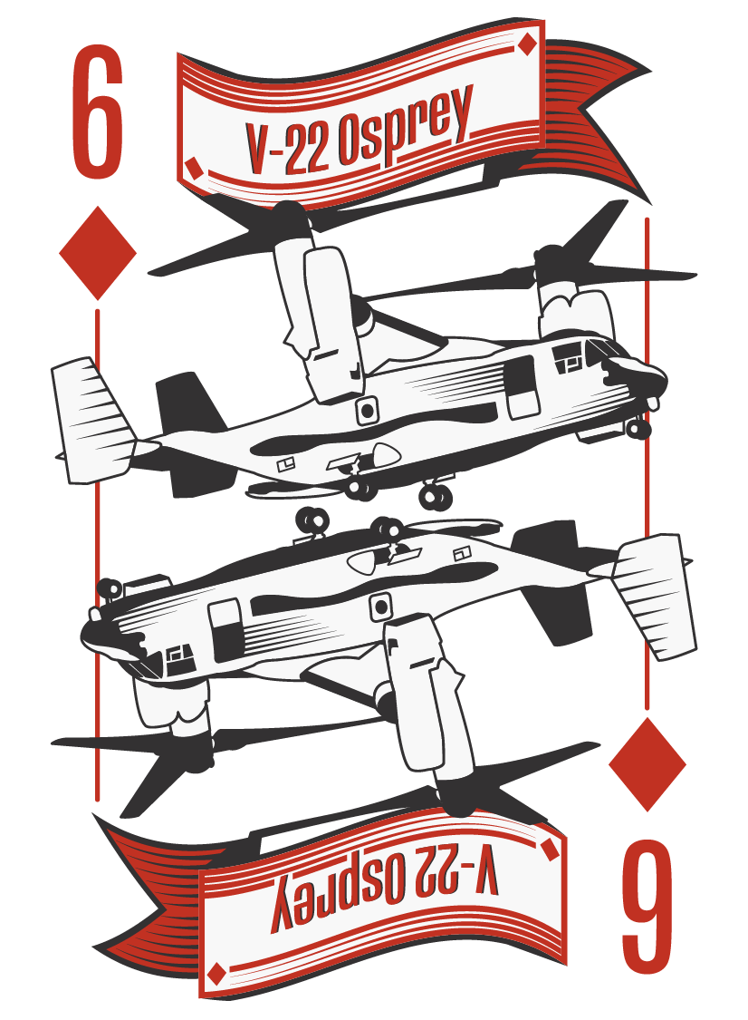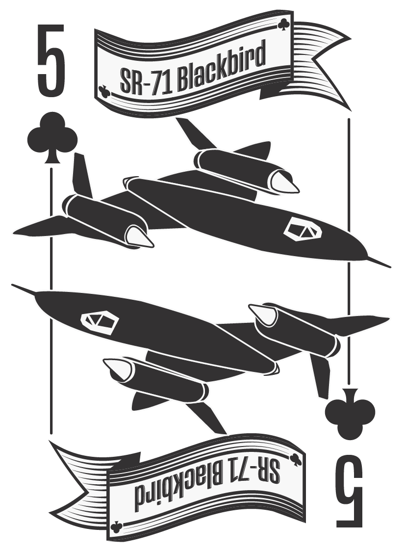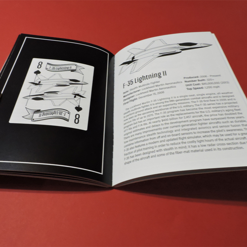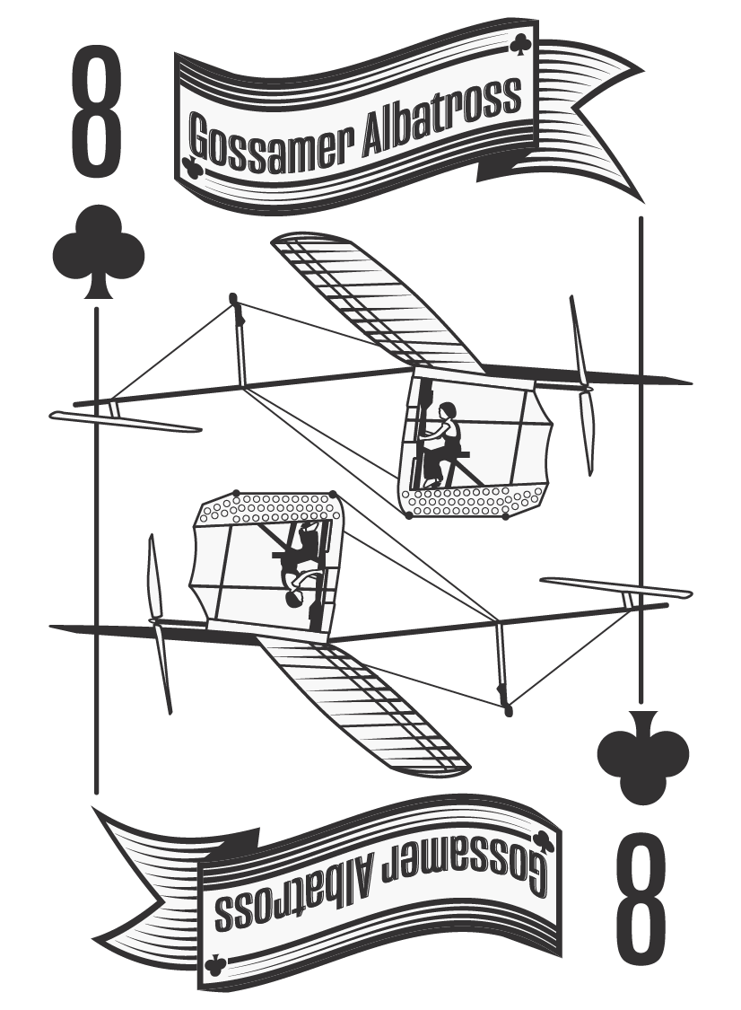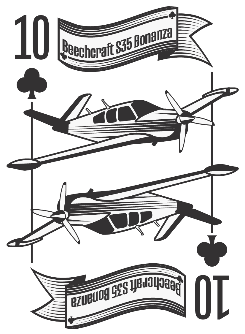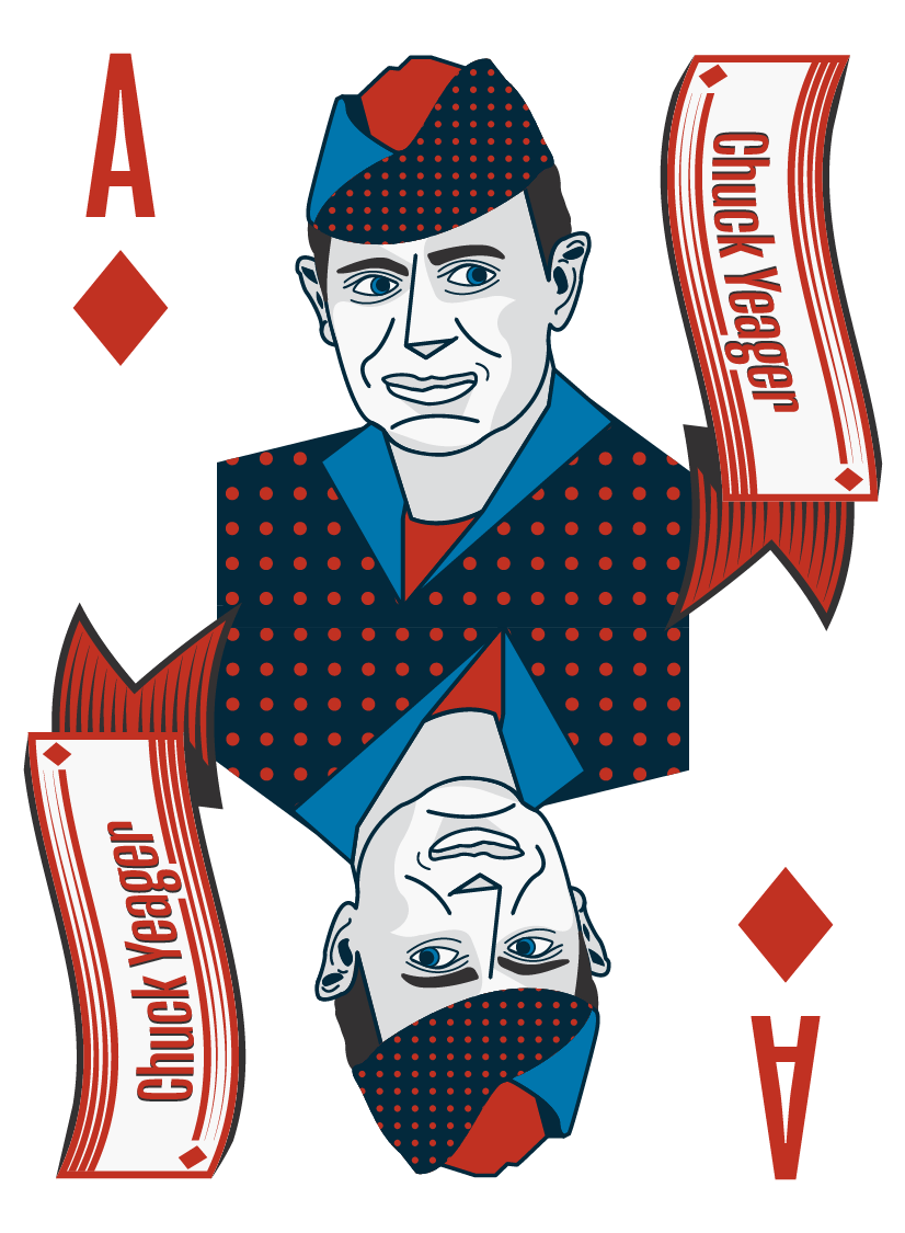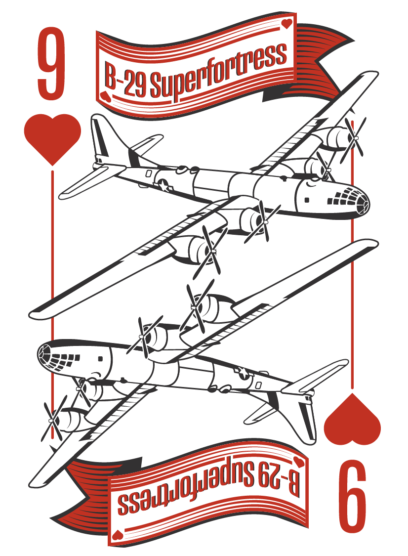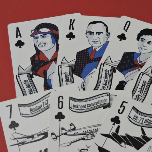 The number cards in this deck feature famous types of planes like the Bell-x1, the first plane to go faster than the speed of sound. Also features the Rutan Voyager, first aircraft to fly around the world without refueling. The face cards feature prominent aviators like Amelia Earhart and the Wright Brothers. The Aces feature exceptional pilots like Bob Hoover.